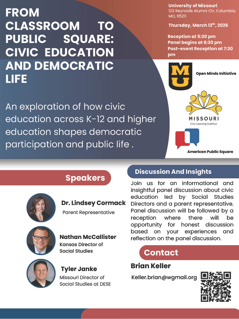 Join us to explore how civic education across K-12 and higher education shapes democratic participation and public life. American Public Square, The University of Missouri Open Minds Initiative, and the Missouri Civic Learning Coalition will host an informational and insightful panel discussion about civic education led by Social Studies Directors and a parent representative. The panel discussion will be followed by a reception where there will be opportunity for honest discussion based on your experiences and reflection on the panel discussion. In-person and virtual options available. Reception begins at 5:30. Panel begins 6:30. Post-event reception begins at 7:30.